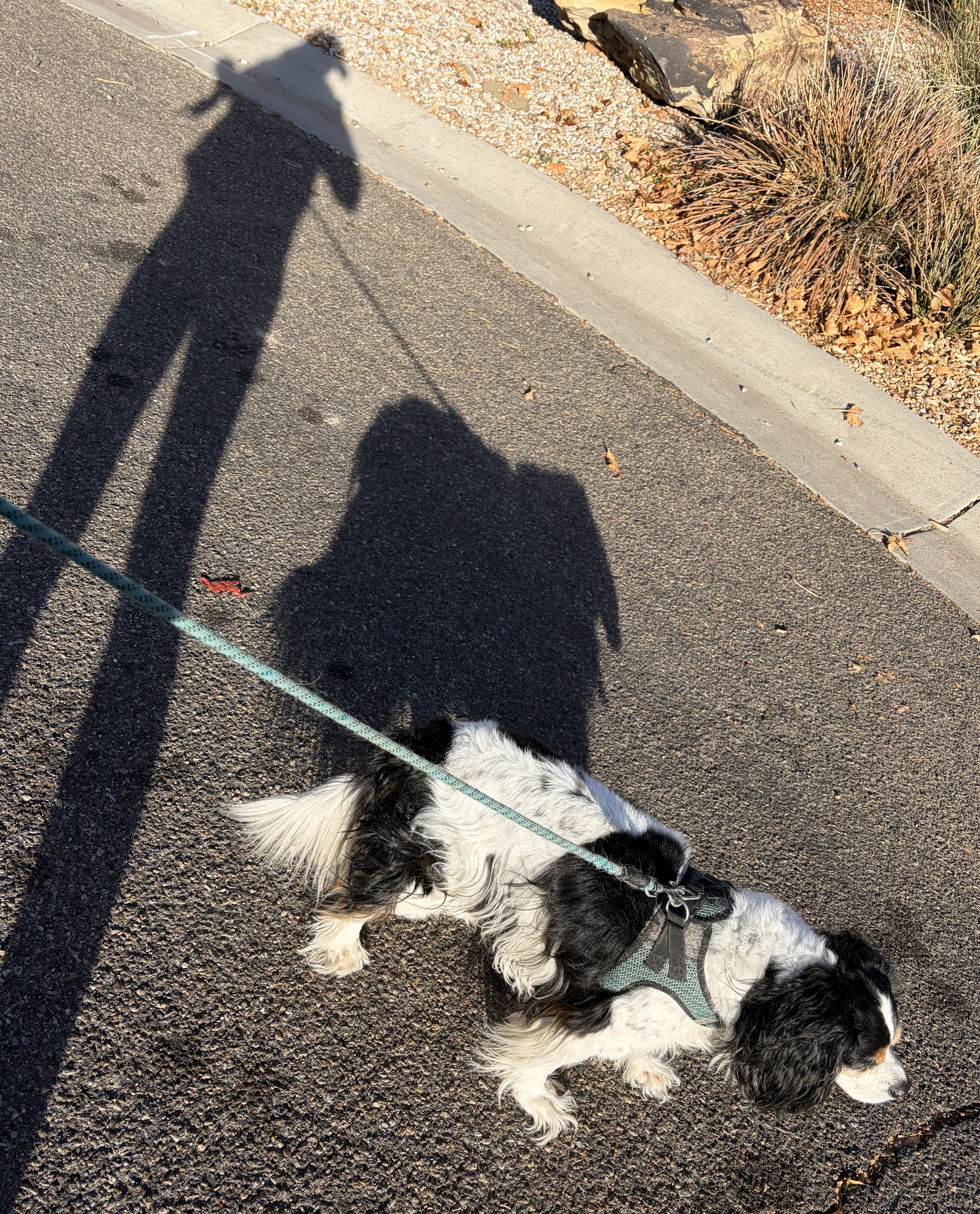 I leashed up Owie—Posa was snoring away, oblivious. We took what felt like a 30-minute walk just to the next block. He sniffed, he peed, he stopped and looked around as if the world was brand-new.